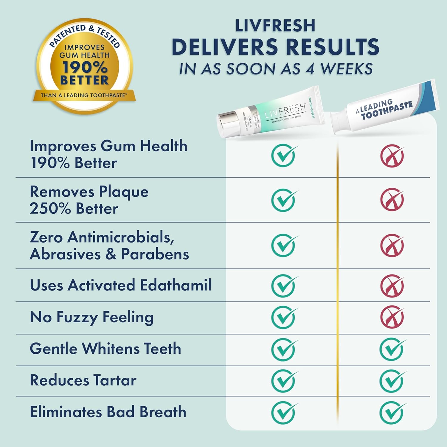 CLINICALLY PROVEN – LIVFRESH removes plaque 250% better, improves gum health 190% more, reduces tartar, eliminates bad breath, soothes dry mouth, and gently whitens teeth better than leading toothpaste brands. Brushing with LIVFRESH can help you save thousands by improving your oral health and preventing expensive dental procedures.
