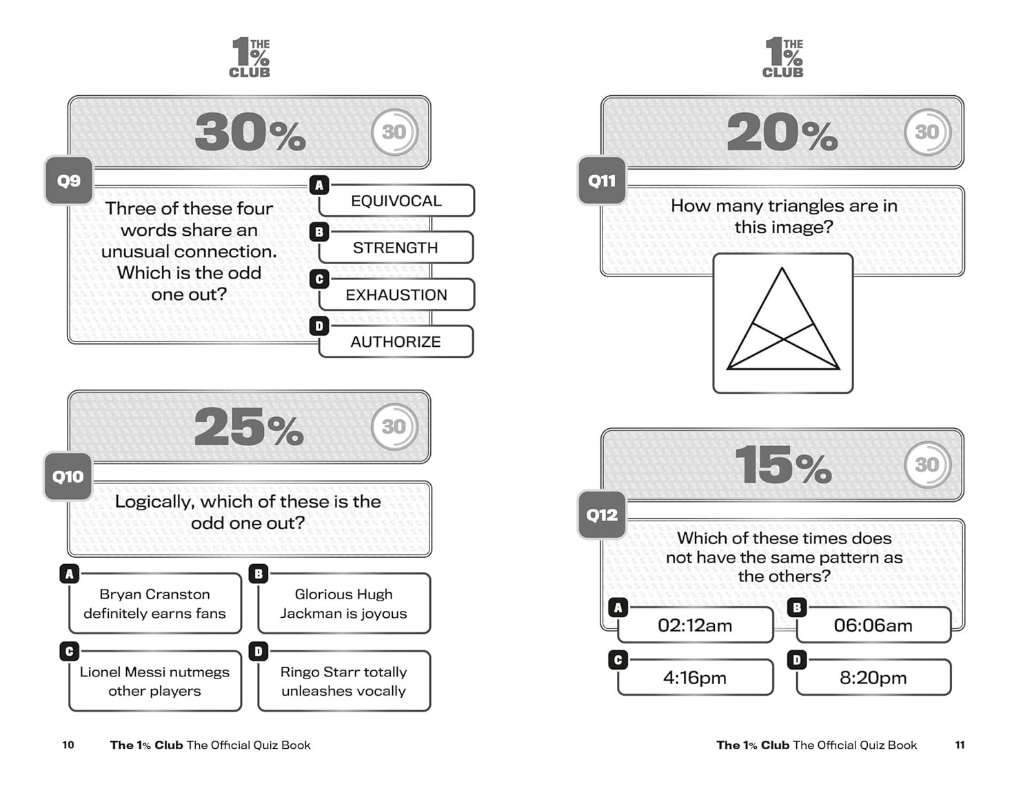 The 1% Club Official Quiz Book, brought to you by the team behind the hit TV show, is a quiz book for all the family, where an 8-year-old has as much chance of winning as an 80-year-old, where intelligence is not based on how many exams you passed, it’s all about how your brain works. Logic and common sense are the key to success.