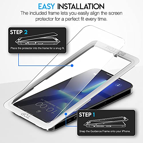 Specification: Maxboost 2 Pack Screen Protector Compatible for iPhone 13 Pro Max [6.7 inch] + 2 Pack Camera Lens Protector Tempered Glass Film HD/9H Hardness (w/Alignment Case Tool Included)