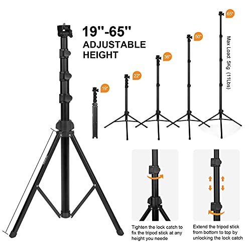 【Desk & 65” Floor Stable Tripod 】The selfie ring light with two tripods can be used either on your table or stand on your floor. The floor tripod can be extended from 19” to 65” which is heigher than other ordinary ring lights. The aluminum alloy pole with improved quick-flip lock makes position firm and sturdy. It supports the use of a mobile phone holder or a camera holder alone.Maximum load is 11 pounds (5 kg).