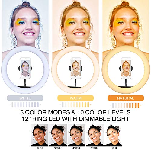 【12” LED Ring Light】The Dimmable Ring Light features 162pcs LED bulbs, the light diverges evenly to let your face is bright and beautiful, and the product can be displayed more clearly. 3 different color modes (warm, natural, cold)and 10 levles brightness by the remote controllert, 3000K to 6000K color temperature, larger ring light has a broader shooting , which can meet your various needs in various occasions.