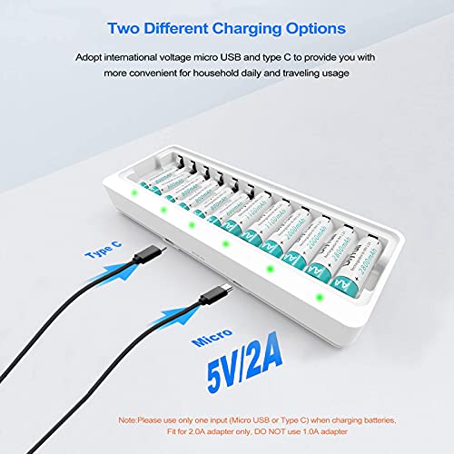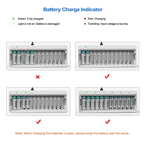-Fast Charging Slot and LED Show: The battery charger charges recharges 2, 4, 6, 8, 10 or 12 AA / AAA Ni-MH Ni-CD batteries at a time(same batteries must be charged in pairs) , and with LED indicator, eliminate the need for multiple household AA/AAA battery chargers