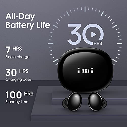 [Playing All-day & Compact Design] A single full charge last for 7 hours of use, plus multiple charges through the charging case, these Bluetooth earbuds can play 30 hours in total. Enjoy all-day listening experience without worry about battery shortage when going out. Less than 50g (two earplugs + one wireless charging box), can be easily put into pocket and carry with you.