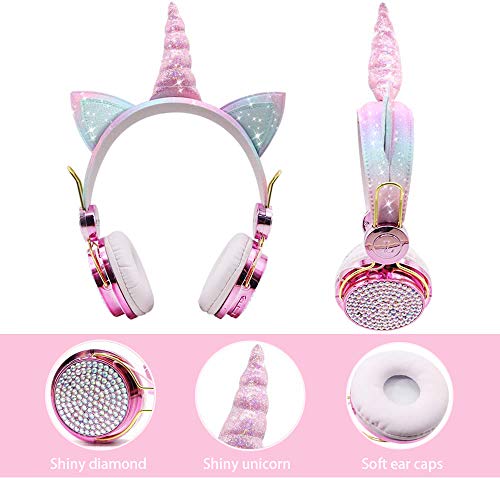 【CUTE UNICORN HEADPHONES】With lovely trendy and glitter unicorn design and cushioned earpads headband, these headphones for girls let your little one lose themselves in audio book and their favorite songs with these fun TCJJ on-ear headphones,specifically designed for ages 3 and over. Also comes with a nice unicorn gift box for storage. Great unicorn gifts for girls kids children and teens.