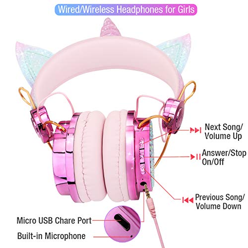 【EXCELLENT AUDIO QUALITY & ADJUSTABLE HEADBAND】The cat ear headphones produce Crisp,clear sound and bumping bass which provides maxmium listening enjoyment for your kids and allow them indulge in music, audiobooks and multiple learning resources. These unicorn headphones for girls are adjustabl. Adjust the headband size to fit different-sized heads, which makes it perfect for toddlers, teens, tween, teenagers, young girls for school, online classes or airplane travelling above the age of 3.