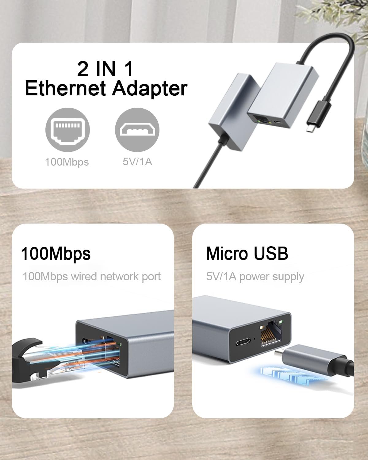 Ethernet Adapter for Fire TV Stick, Micro USB to RJ45 Ethernet Adapter Compatible with Fire TV Stick/4K/4K Max, Cube, Chromecast Ultra Audio – Grey