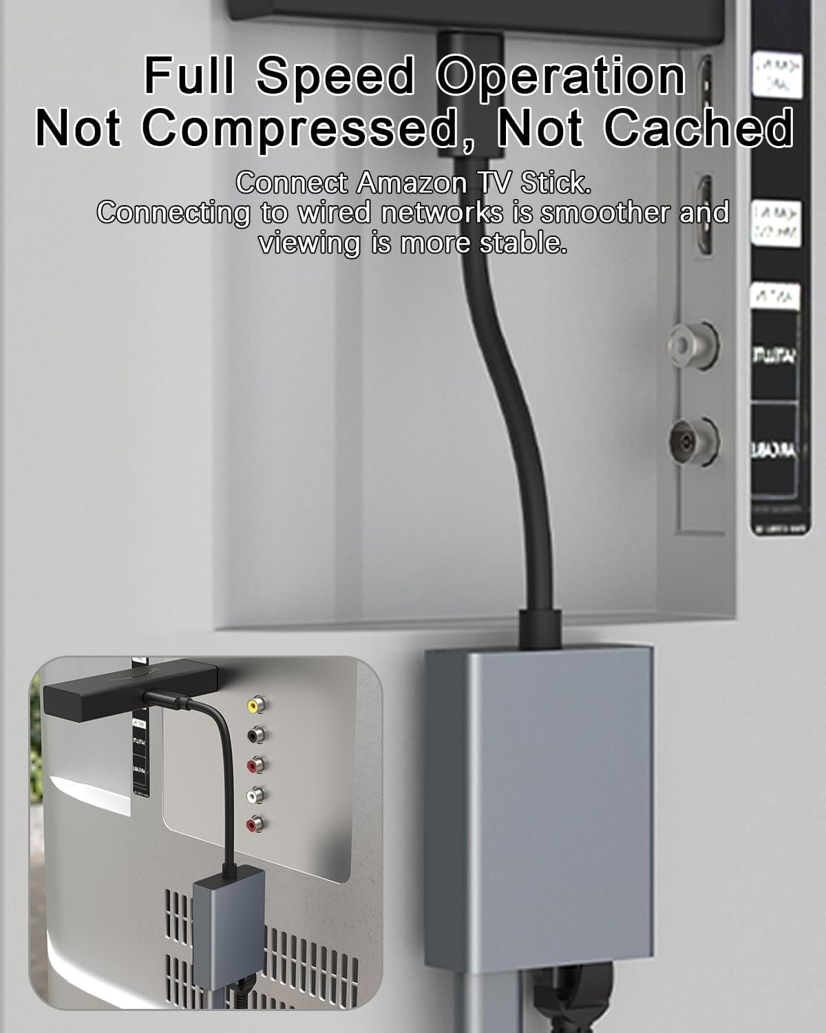 Ethernet Adapter For TV Stick – Our ethernet adapter is designed specifically for Fire TV sticks. With our Ethernet adapter for the Fire TV stick, the Ethernet cable connector can be directly connected to the TV stick, perfectly solving problems such as unstable wireless network connection, weak signal, and delay Let you enjoy a better visual experience.
