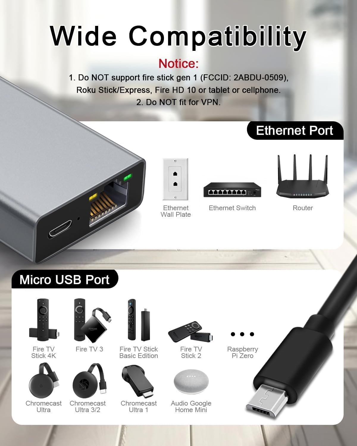 Design With Indicator Lights – The Ethernet adapter also comes with two status lights to aid in diagnosis/testing. This makes troubleshooting easier and lets you know if the network is functioning properly.Pre-Use Instructions – Suitable for Fire Stick TV 4k, Google Home Mini, chromecast ultra audio, etc.NOT compatible with Fire TV stick gen 1, Chromecast with Google TV(HD)/Chromecast with Google TV(4K), roku stick/express, fire HD 10 or tablet or cellphone; Does not fit for VPN.