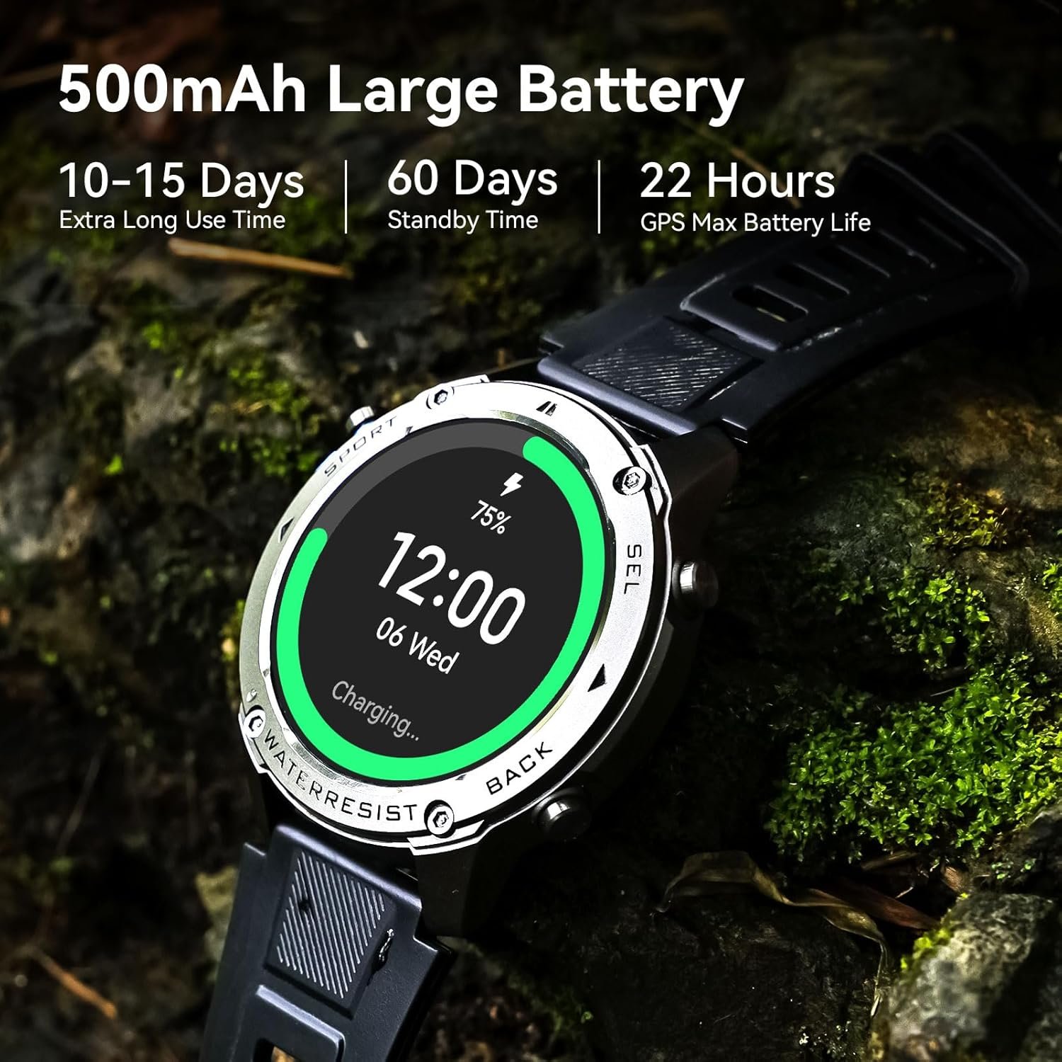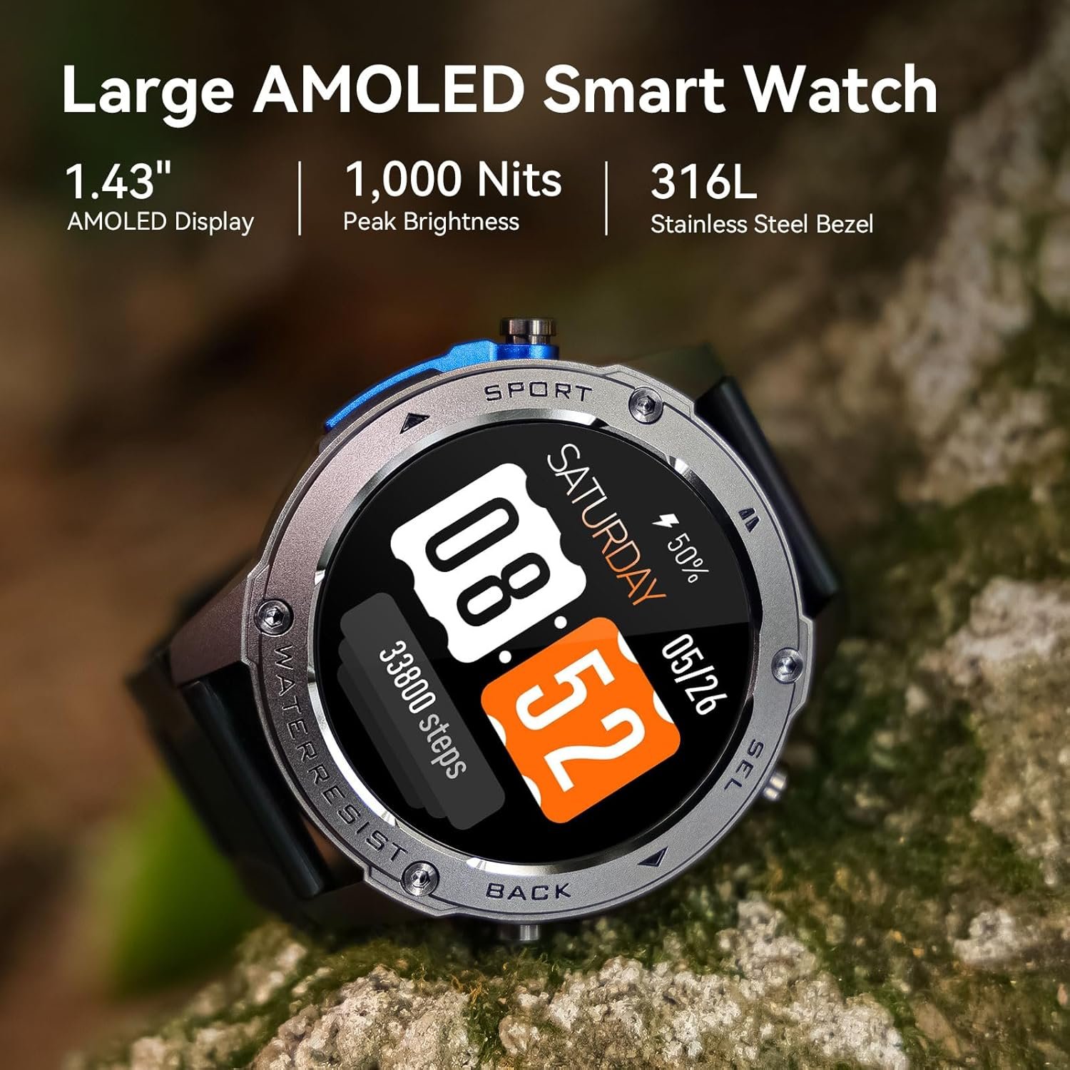 Military Smart Watch for Men GPS 6 Satellite Positioning Compass 164 Feet Water-Resistant for Swimming 500mAh Battery Make Answer Call Rugged Metal Body Smartwatch 1.43″ AMOLED Always On Display Watch