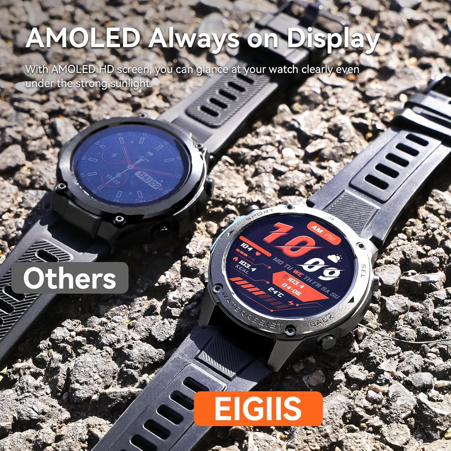 ⌚Military-Grade with Full Metal Construction: Designed for durability, EIGIIS military smart watch for men has high quality tempered glass to resist scratches and impacts. Its military-grade stainless steel body meets the MIL-STD-810H standard, having passed 15 rigorous military tests, including exposure to salt, rain, and shock. Ready for the toughest environments.