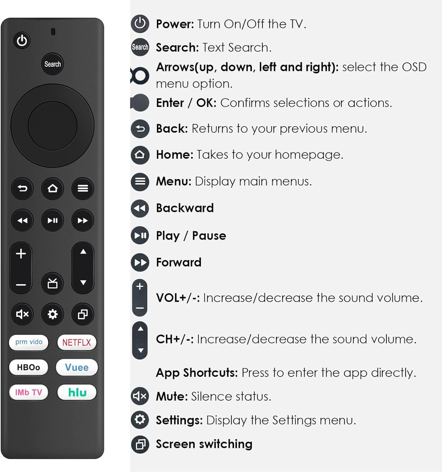 6 Shortcut Keys: Prime Video, Netflix, HBO, IMDB-TV, Vue and Hulu buttons, quickly access your favorite apps.