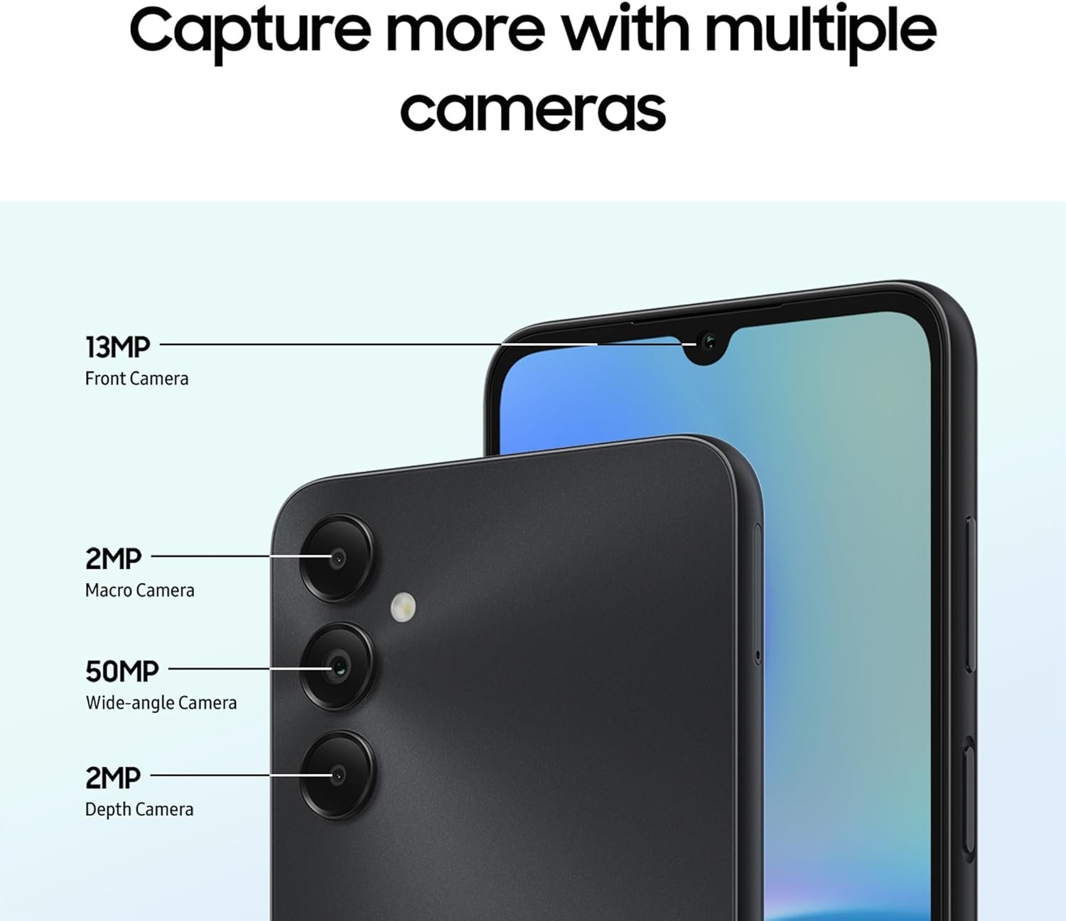 Capture more with multiple cameras: Galaxy A05s boasts a comprehensive camera system, Four cameras including the 13MP Front Camera, 2MP Macro Camera, 50MP Wide-angle Camera and 2MP Depth Camera, Ensuring versatility to capture every moment