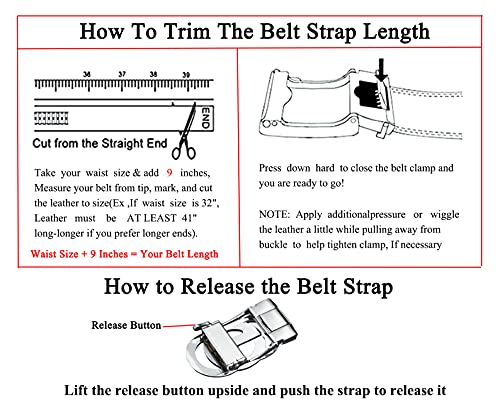 EASY USE–Just slide the belt into the buckle and pull the belt through, the buckle simply auto locks the belt, to release the belt, gently push the lever on the side of the buckle and lock will snap. Simple, smooth and sleek;