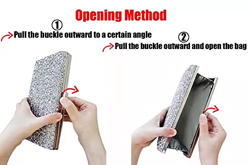 Firstly pull the buckle to a certain angle and open the bag. MATERIALS: pu leather, designed with rhinestone on one side, slippy and soft polyester lining. Magnet hook closure, adding the security of the stuff inside.