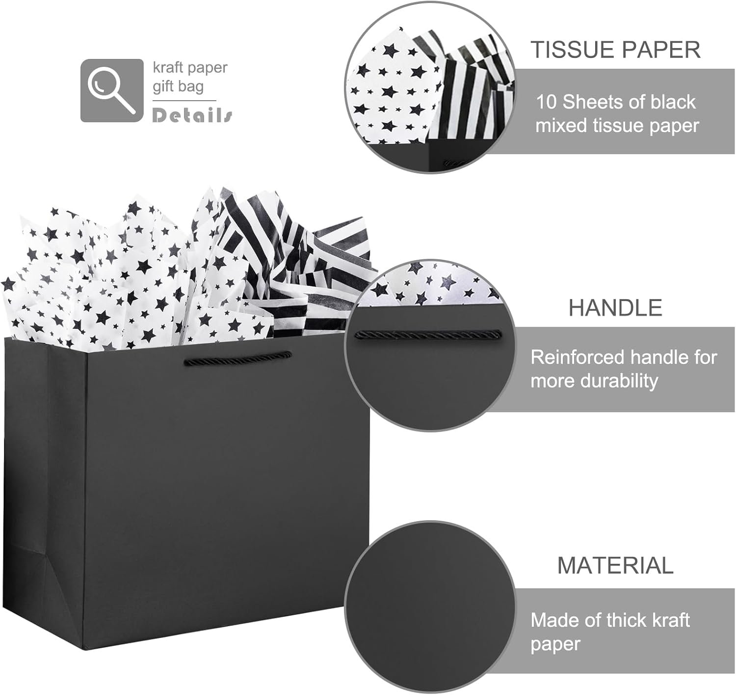 ๐Measure: Our pack contains 4 pcs extra large black gift bags and 10 sheets of silver tissue paper (5 of silver stars & 5 of silver stripes). Each bag measures 16โ length x6โ width x 12โ height (40cm x 15cm x 30cm). Each tissue paper measures 20โ x 26โ (50cm x 66cm).