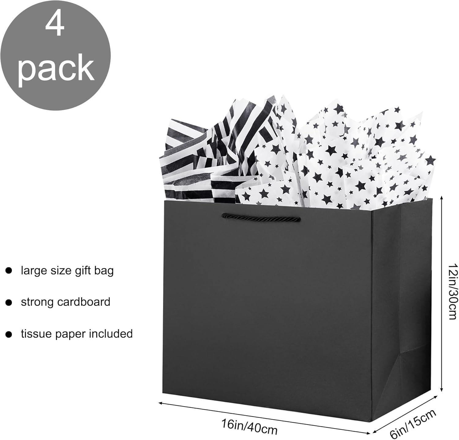 4 Pack Extra Large Black Gift Bags, Large Gift Bags with Tissue Paper, 16x6x12 Inches, Gift Bags for Small Business, Bridal Showers, Wedding, Christmas