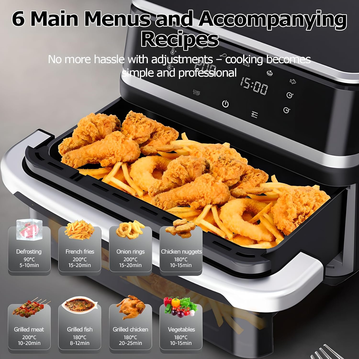 【Dual Air Fryer Design】: Our air fryer double features two 5L baskets, allowing you to cook separate food items simultaneously. This efficient design means you can prepare a complete meal in less time, making it perfect for families or gatherings.
