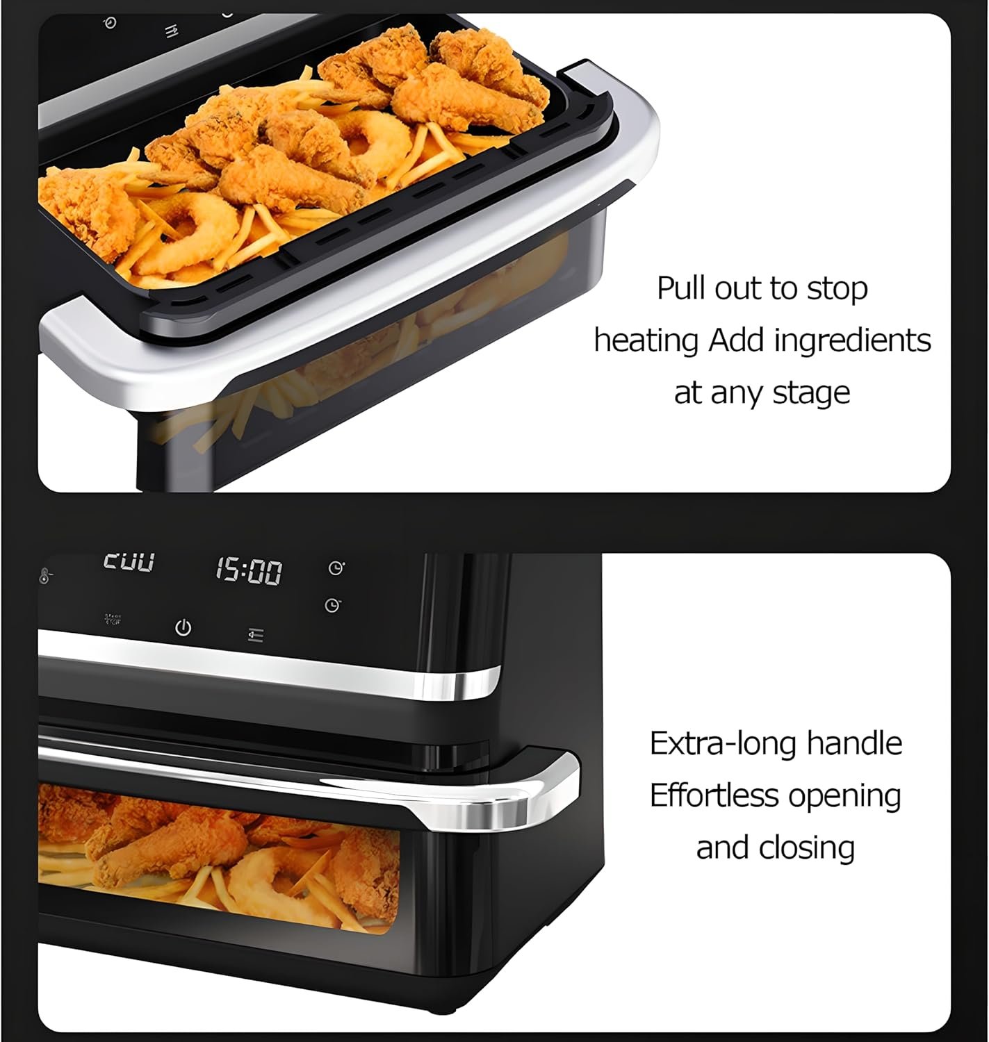 【Precise Temperature Control】: The dual air fryer oven operates between 80-200℃ and comes equipped with a timer, ensuring that your food cooks perfectly every time. The automatic shut-off feature prevents overcooking, giving you peace of mind while you multitask in the kitchen.