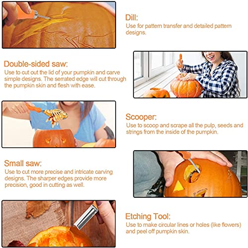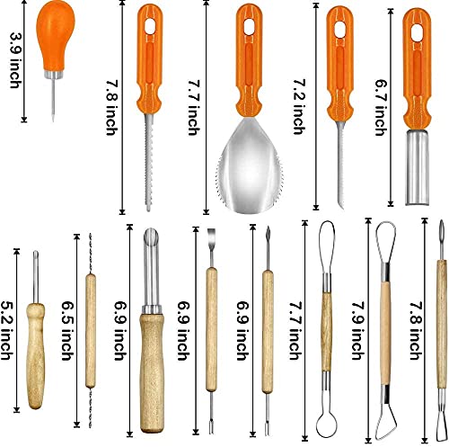 【PUMPKIN CARVING KIT 】: 13 pieces high-quality professional halloween pumpkin carving tools kit includes 6 double-sided stainless-steel detail carving, cutting and engraving tools, 2 sharp heavy-duty stainless steel pumpkin shovel tools with scraper, 2 sturdy tooth saws, 2 hole and circle punches, 1 engraving pen. Different sizes of engraving tools can peel off the skin and shape the design, creating eye catching, show stopping fun Jack-O-Lanterns that will impress your friends and family.