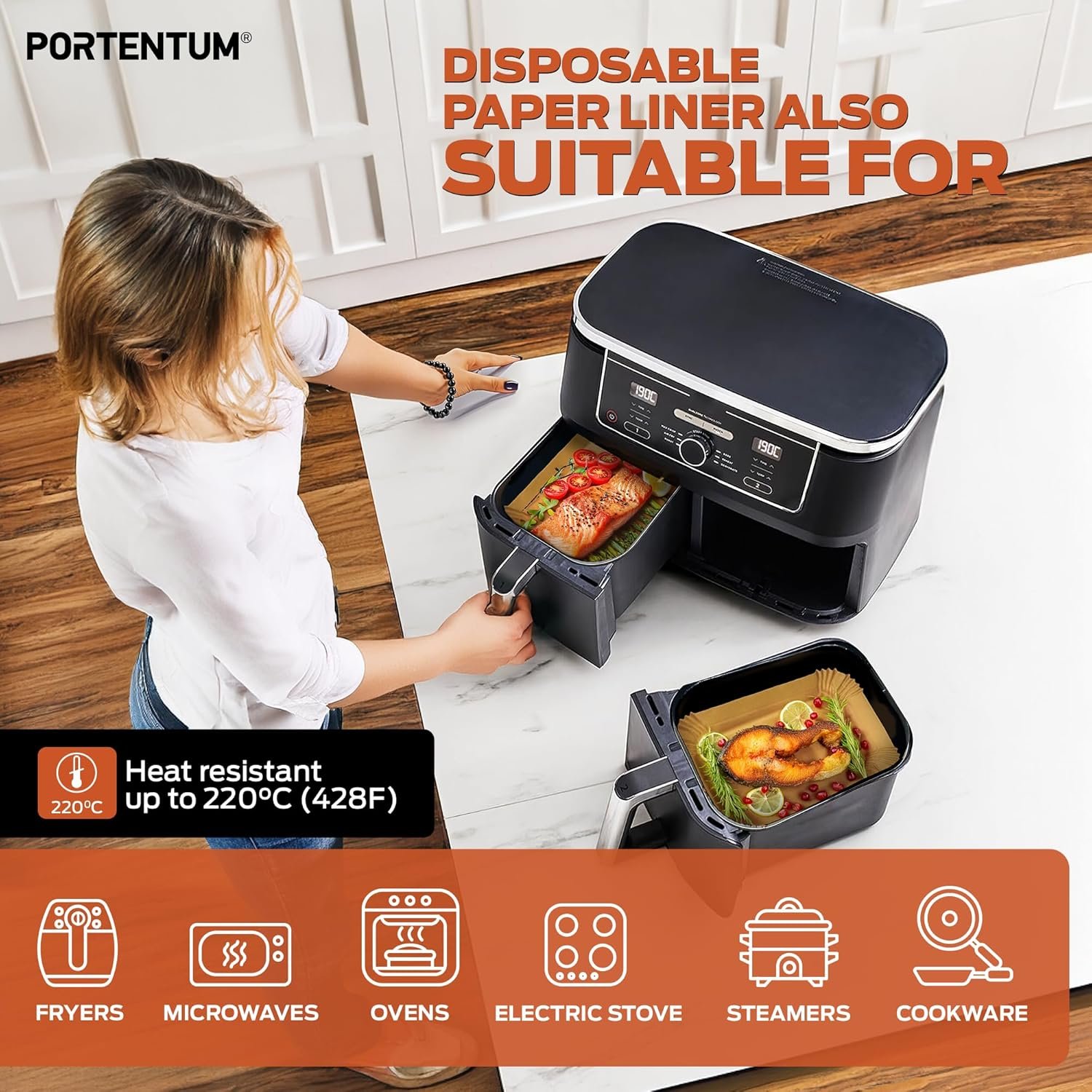 PORTENTUM Air Fryer Liners 100PCS Disposable, Unbleached and Greaseproof. Suitable for Dual fryers from 5.2 to 10 liters. Food-Grade use Baking Paper BPA Free, FDA, and LFGB Certified