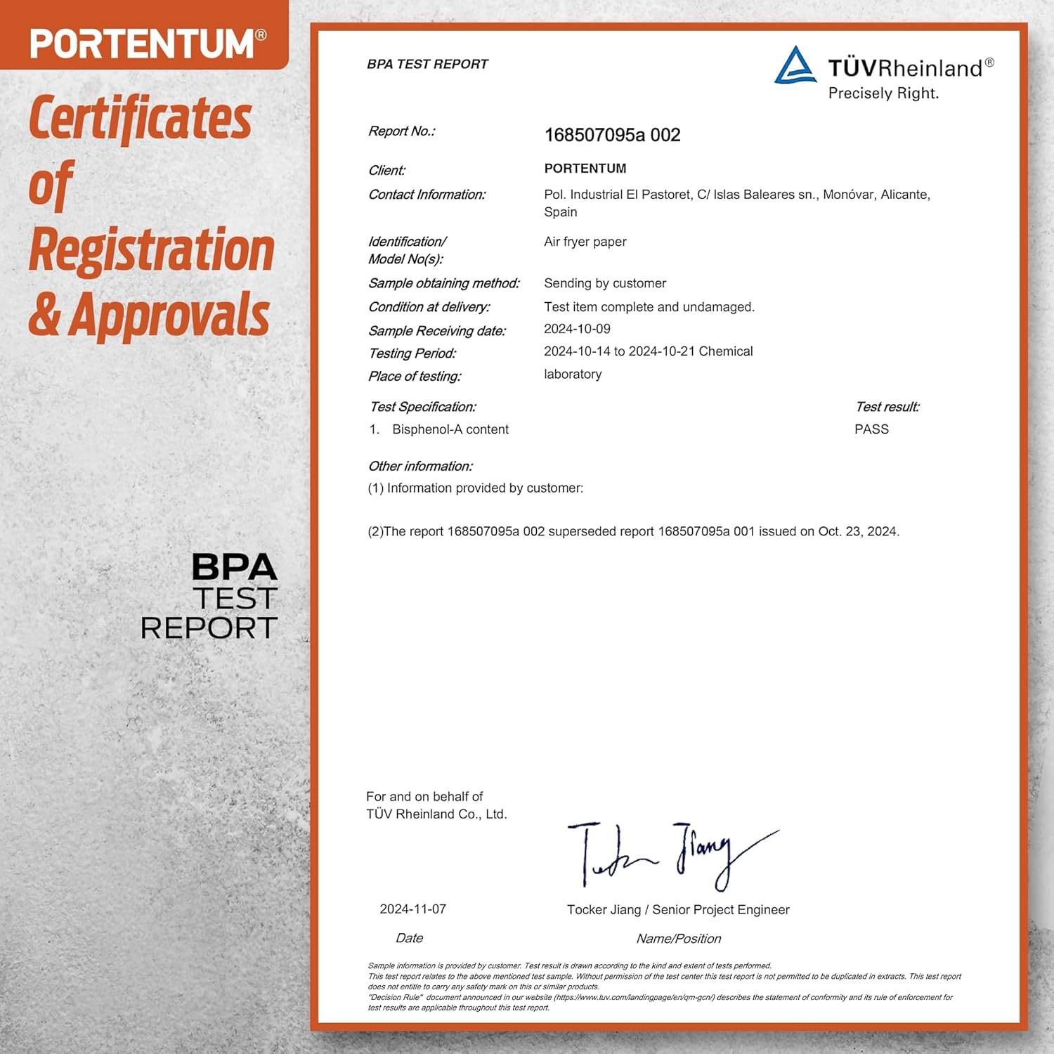 FOOD GRADE CERTIFIED. Our air fryer paper is made with food-safe materials, free of Bisphenol A (BPA), complying with the strict quality and safety standards of Germany (LFGB) and the FDA regulations of the United States, ensuring it does not transfer toxic substances or alter food.