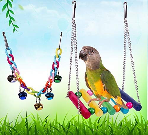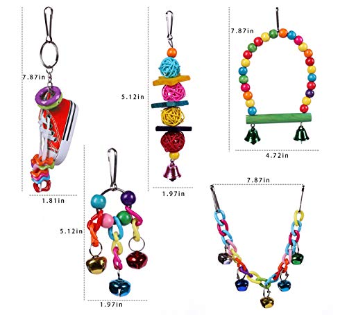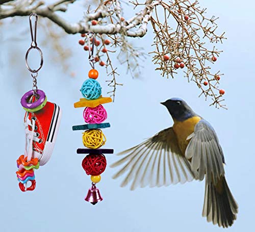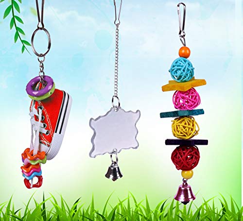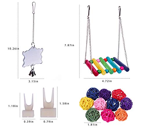 【PACKAGE INCLUDES】 Total 19 parrot toys, 1*Wooden Swing with Bell, 1*Acrylic Swing withBell, 1*Hanging Woven Chew ToyS, 1*Sneaker Toys. 2*bell toys, 1*Bird Mirror Toys, 2*Bird Shaped Fruit Fork, 10*Rattan Ball (Random Color).